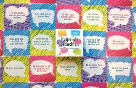 Met welke helpende gedachte kun jij je prettiger voelen, of een beter resultaat halen? Kies één of meer kaartjes uit een van de categorieën of trek er een aantal zonder te kijken. Wat is de beste? Probeer die gedachte de komende week uit.