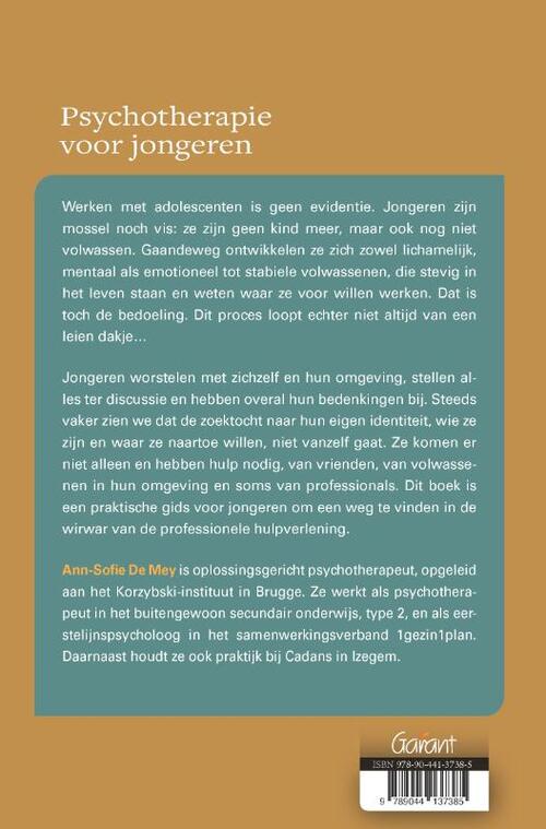 Werken met adolescenten is geen evidentie. Jongeren zijn mossel noch vis: ze zijn geen kind meer, maar ook nog niet volwassen. Gaandeweg ontwikkelen ze zich zowel lichamelijk, mentaal als emotioneel tot stabiele volwassenen, die stevig in het leven staan en weten waar ze voor willen werken. Dat is toch de bedoeling. Dit proces loopt echter niet altijd van een leien dakje... Jongeren worstelen met zichzelf en hun omgeving, stellen alles ter discussie en hebben overal hun bedenkingen bij. Steeds vaker zien we dat de zoektocht naar hun eigen identiteit, wie ze zijn en waar ze naartoe willen, niet vanzelf gaat. Ze komen er niet alleen en hebben hulp nodig, van vrienden, van volwassenen in hun omgeving en soms van professionals. Dit boek is een praktische gids voor jongeren om een weg te vinden in de wirwar van de professionele hulpverlening. Ann-Sofie De Mey is oplossingsgericht psychotherapeut, opgeleid aan het Korzybski-instituut in Brugge. Ze werkt als psychotherapeut in het buitengewoon secundair onderwijs, type 2, en als eerstelijnspsycholoog in het samenwerkingsverband 1gezin1plan. Daarnaast houdt ze ook praktijk bij Cadans in Izegem.